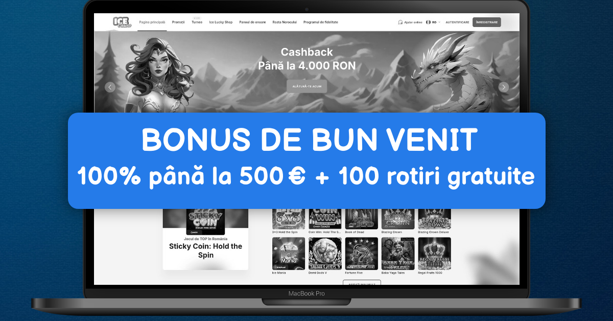 Ice Casino oferă un bonus de bun venit de până la 1500 EUR plus 270 de rotiri gratuite la prima depunere. Acest bonus se ajustează în funcție de suma depusă. Jucătorii noi din România beneficiază de un bonus fără depunere de aproximativ 100 RON, care permite testarea platformei fără risc financiar inițial.